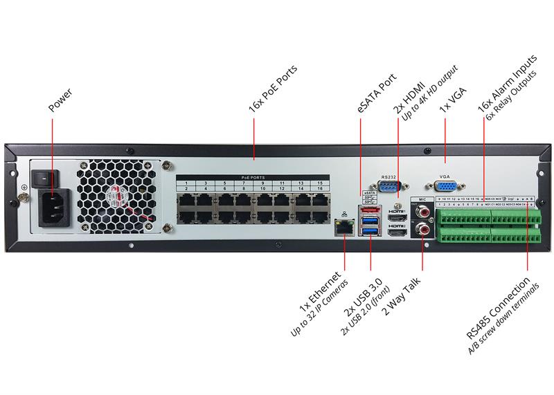 32 Channel 16 PoE Plug-and-Play NVR Back Panel of 2U 32 Channel 16 PoE Plug-and-Play NVR |
